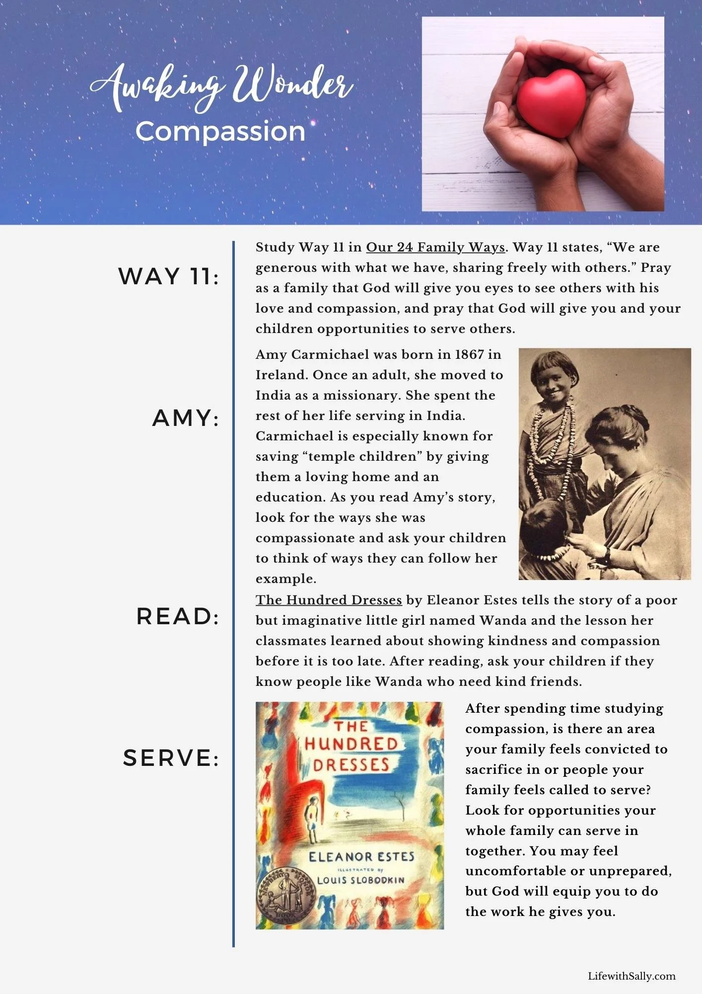 In this season of giving thanks, this month we're going to focus on compassion. We'll spend time in scripture, look to the example of others, and read a story focused on compassion. We pray this focus inspires your family to show compassion on the people God brings into your lives.