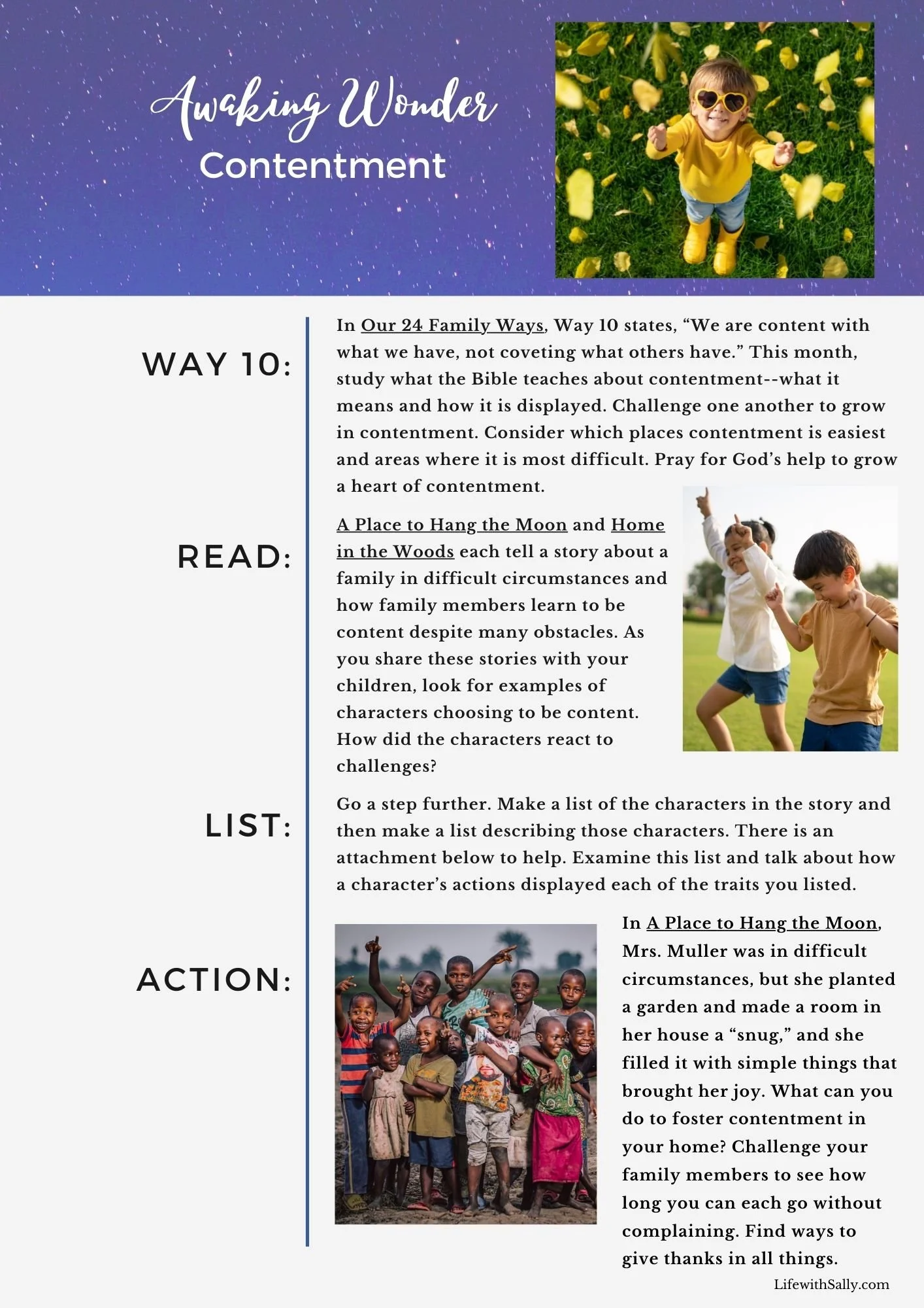 This month, using Bible study and the examples created in book characters, we are going to learn about contentment. Fostering the quality of contentment in your family leads to many other spiritual blessings. A content heart is a thankful heart. A content spirit is a peaceful spirit. A content family is a joyful family. For moms, we have suggested a classic novel that also follows a theme of contentment. In that case, discontent leads the title character to destruction while another character's pursuit of contentment leads to faith in God and a life well lived.