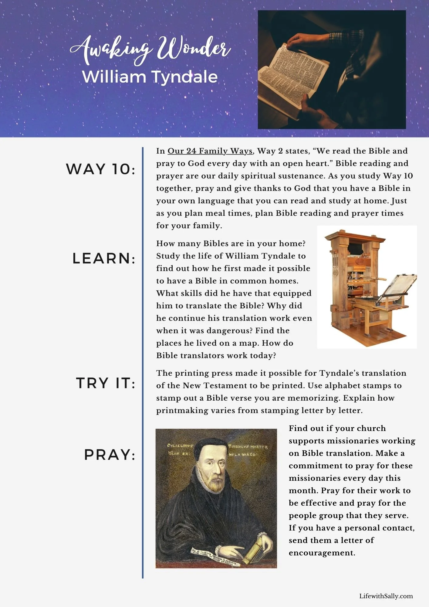 This month, we are learning about William Tyndale alongside the importance of daily prayer and Bible reading. Tyndale translated the first English New Testament before he was martyred in 1536. Please use caution in the way you present his story to young and sensitive children. You may choose to focus on Bible translation in general. Translation is an ongoing process even today with missionaries hoping to have copies of the Bible in the heart language of every person on earth.