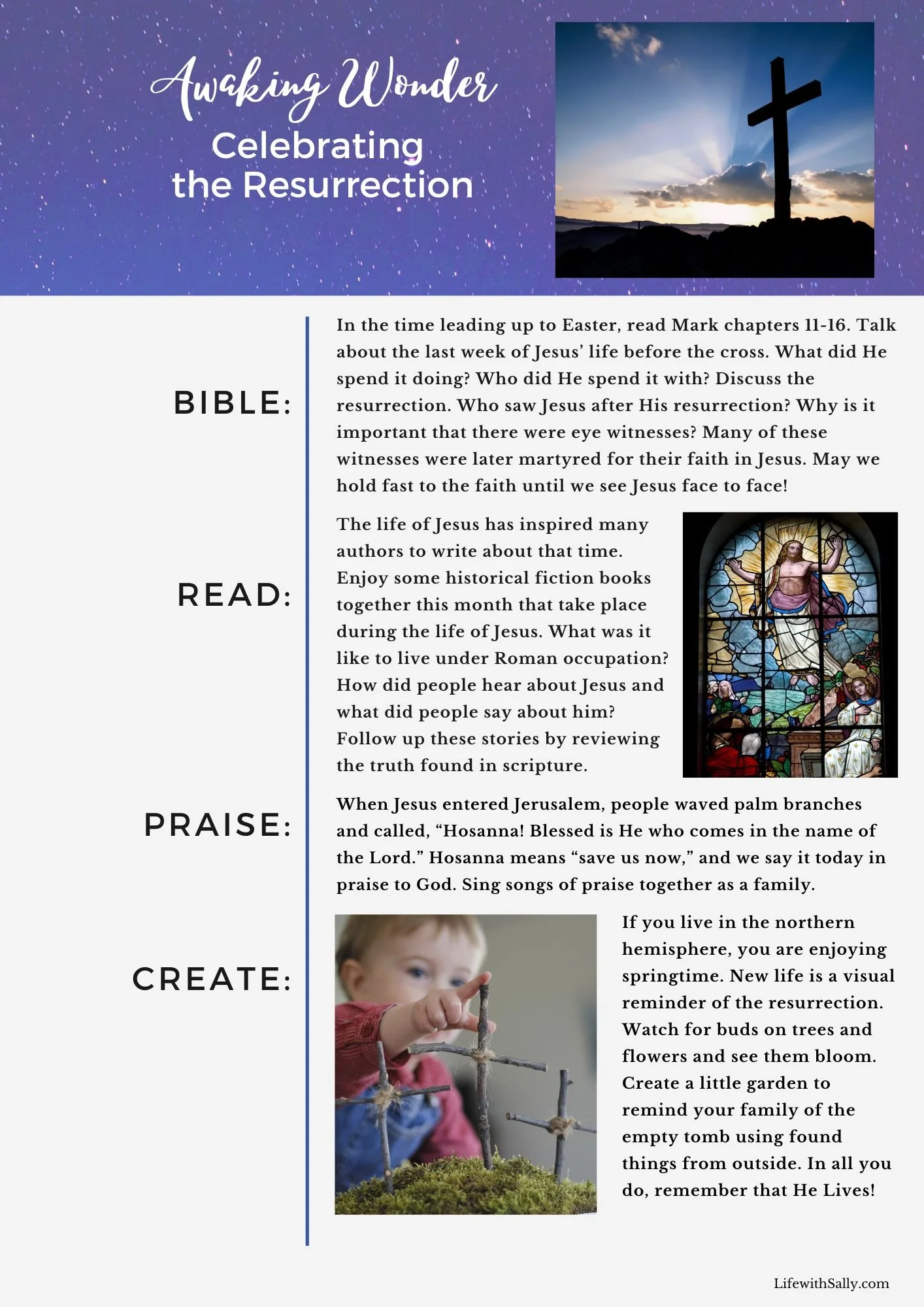 We hope this month's Awaking Wonder unit will help your family prepare your hearts for Easter. As you read scripture together, try to imagine what it was like on the day Jesus died--how dark, lonely, and frightening that must have been. When you read about the resurrection, think about the hope that filled the witnesses' hearts. He is not dead. He is risen! He is still our hope today. Each time you read scripture, praise God, and pray together, you are preparing your children for their future. Day by day, you can equip them with habits and knowledge, and you can pray and trust God to do His work in their hearts.