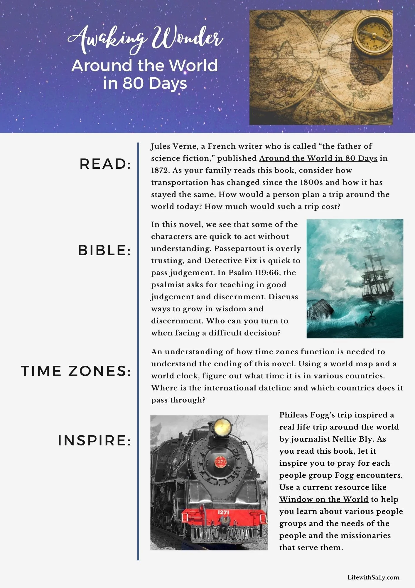This month, you will take a trip around the world through a novel. This story was written in the 1800s and it has the cultural notions and sensibilities of that time. You will find many points for family discussion. As an aside, if you or your children are easily distracted from daily tasks by doing something you enjoy, pay attention to Mr. Fogg and make note of what he misses while playing whist. We're praying this unit awakens your children's hearts to a need to pray for the people of the world. Enjoy your adventure!